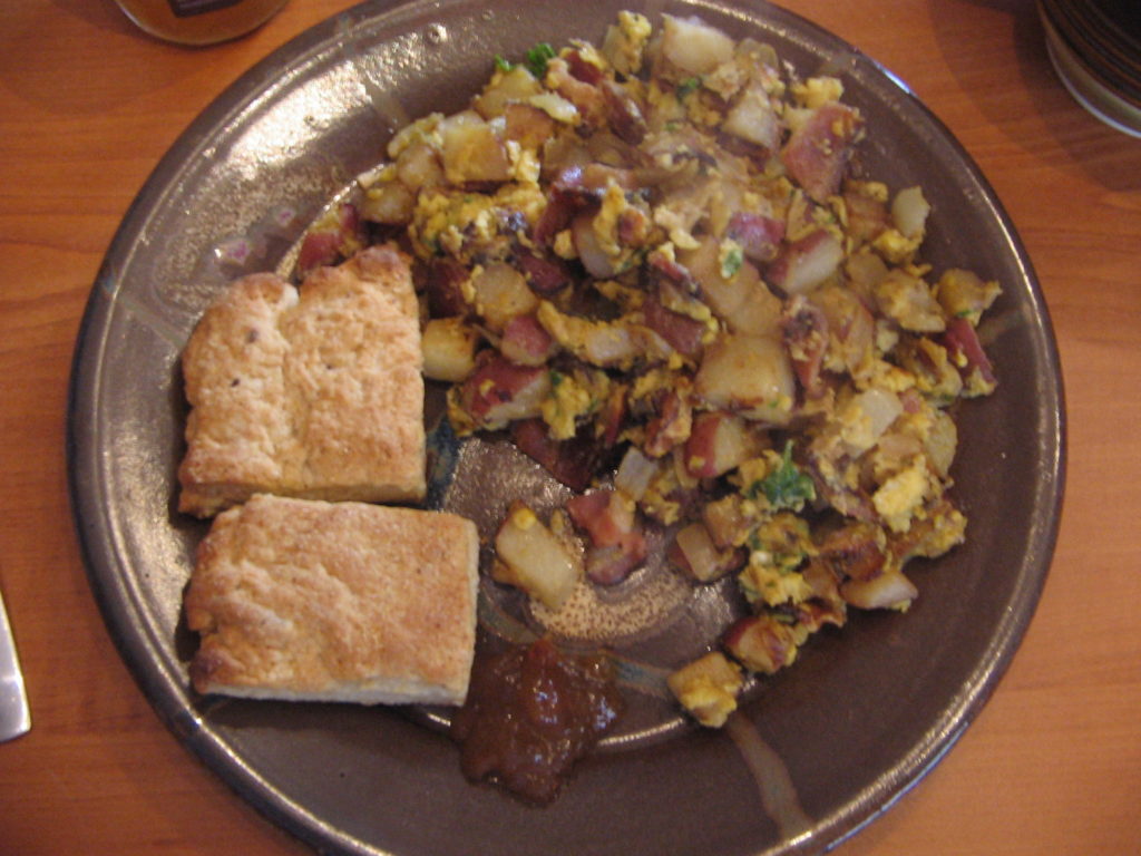 This evening I had the delight of discovering a fresh new egg from one of the younger ladies. It’s hard
