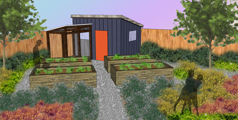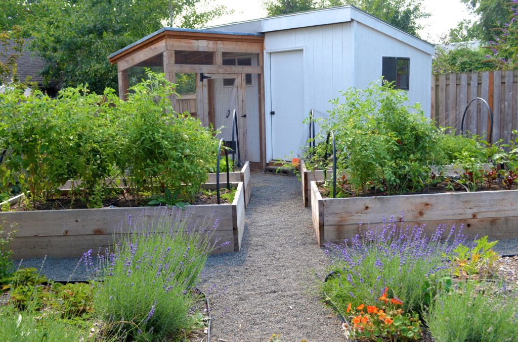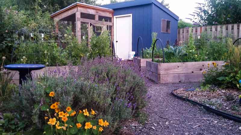 We began cutting sod and sheet mulching to rehab the nutrient-sapped, heavy clay soil. The first trees and large edible shrubs were planted well before our moving boxes were unpacked. My many years of homesteading and experience in landscape architecture helped the homestead take shape quickly. The major elements include larger raised beds, pergola/patio space, in-ground irrigation, crushed rock pathways, and a dilapidated outbuilding rebuilt into a combination chicken coop/garden shed.